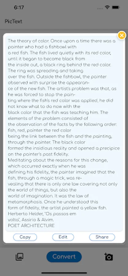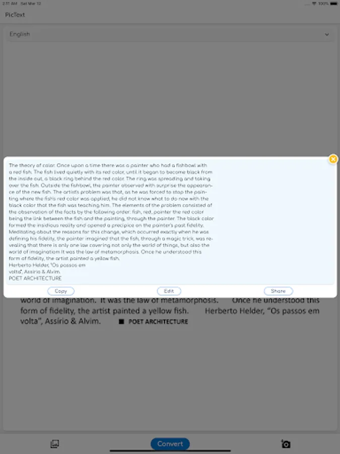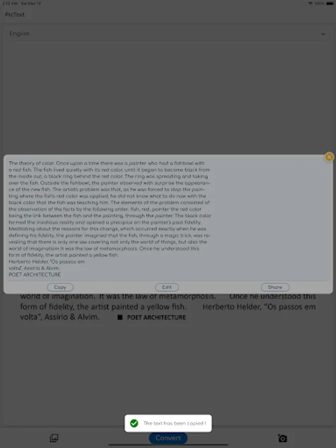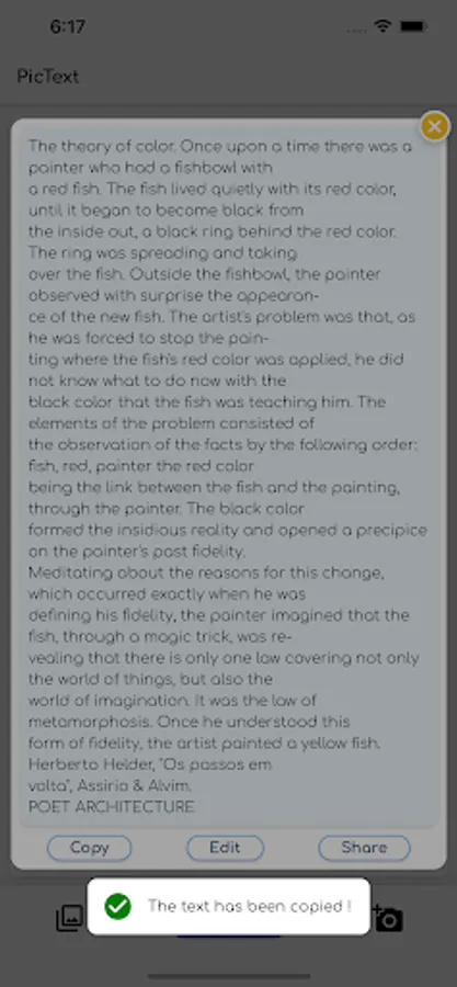 An alert that contains the detected text will be shown, you can then share the text or edit it or copy it.