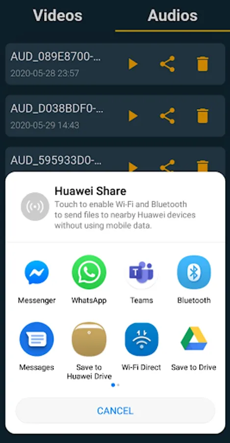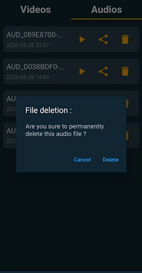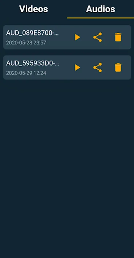 On the audios tab you will notice that the audio is added, you can play, share or delete it.