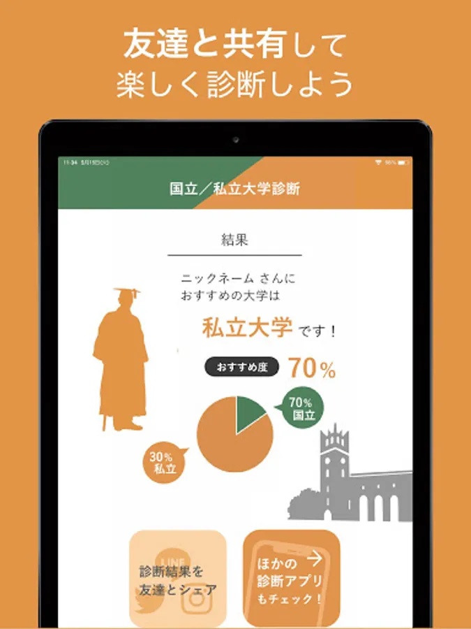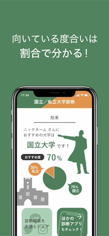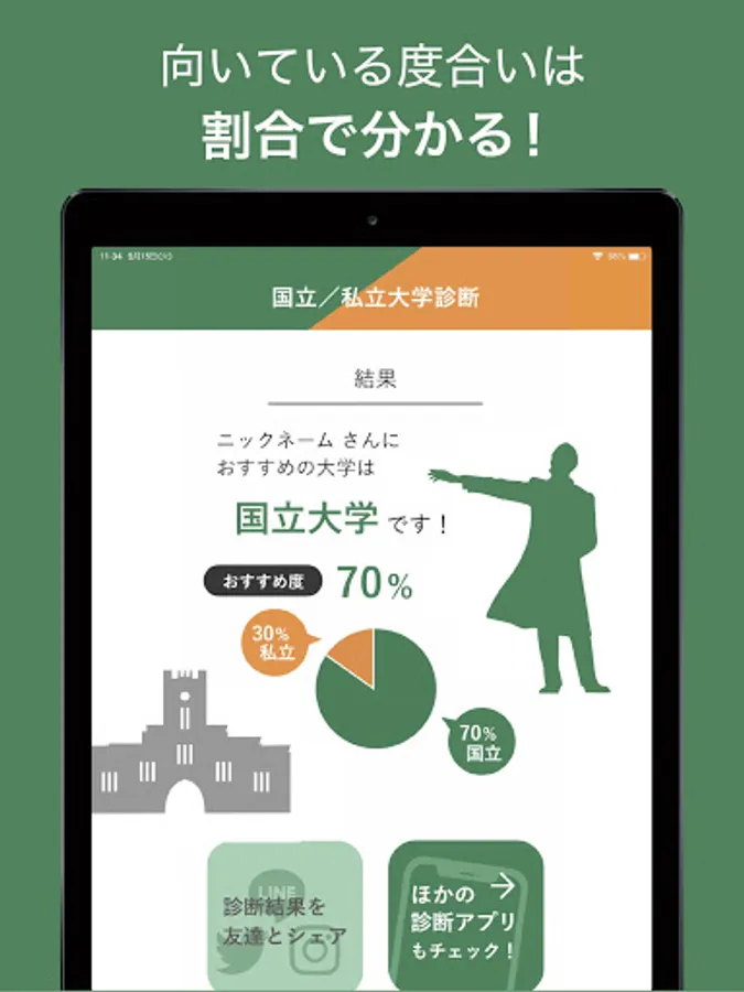 * This app uses our original AI to measure whether your way of thinking is closer to that of a senior who entered a private university or a national university, and does not completely determine your aptitude. We hope that the results will only serve as a reference for career selection.