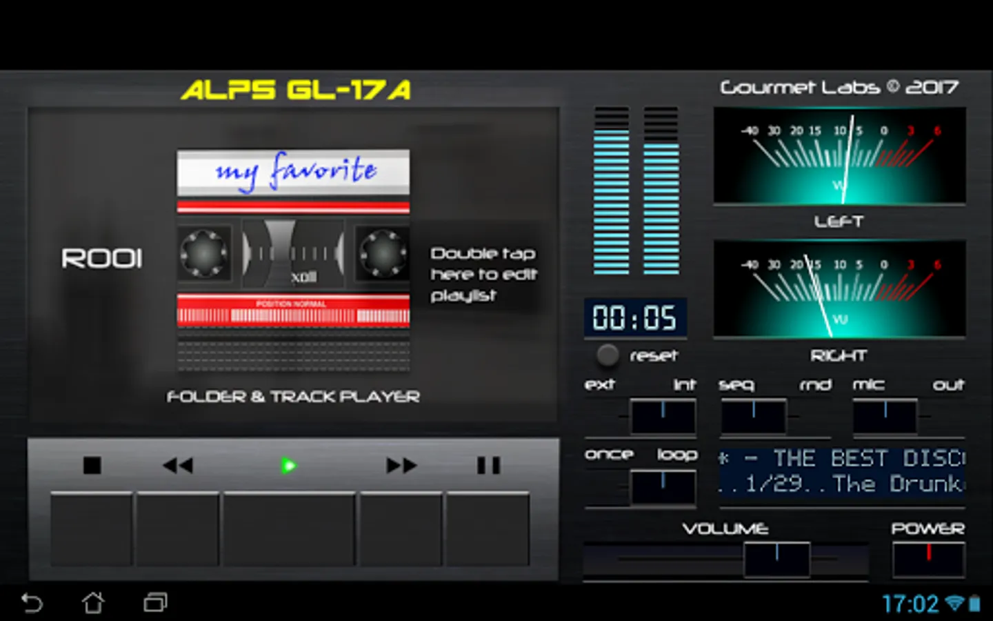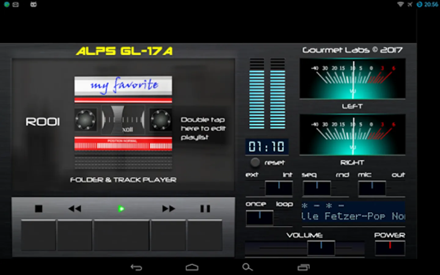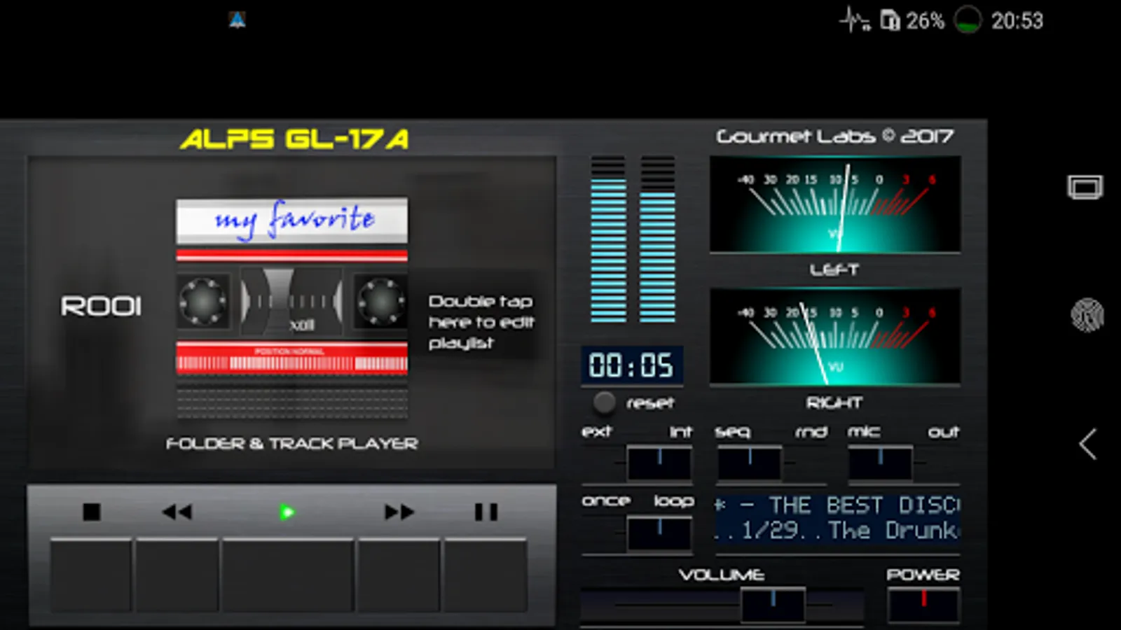 PLEASE READ INSTRUCTIONS BEFORE USE! This is a music player for entire folders and individual tracks. It supports all music formats supported by Android. Even it can control third party players and show playing sound level. Interface simulates main controls and indications including alive VU-meters. Entire look and feel are based on one of the famous cassette deck from near past. The name is fictitious. Remove A from name end to find same app without ads.