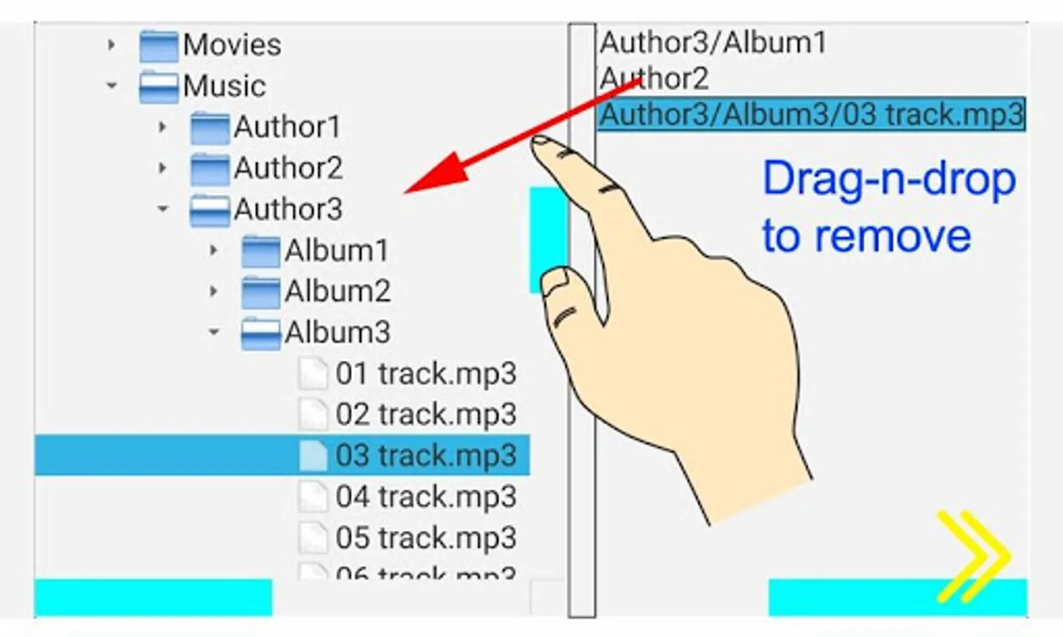 - collect playlist from entire folders and/or individual tracks - folders can contain unlimited number of subfolders - all music inside them will be played