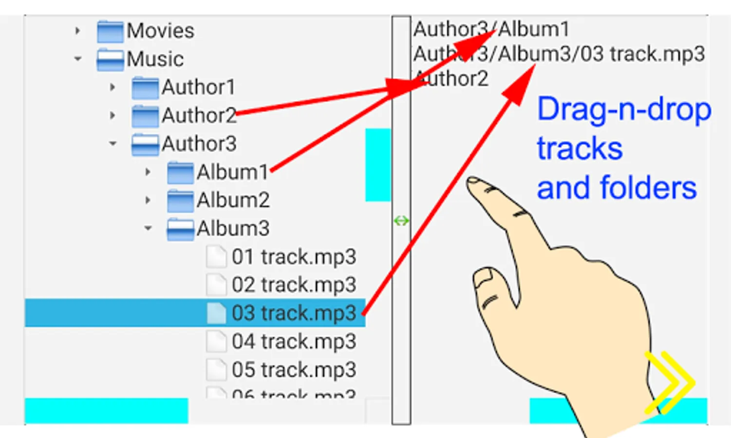 - collect playlist from entire folders and/or individual tracks - folders can contain unlimited number of subfolders - all music inside them will be played