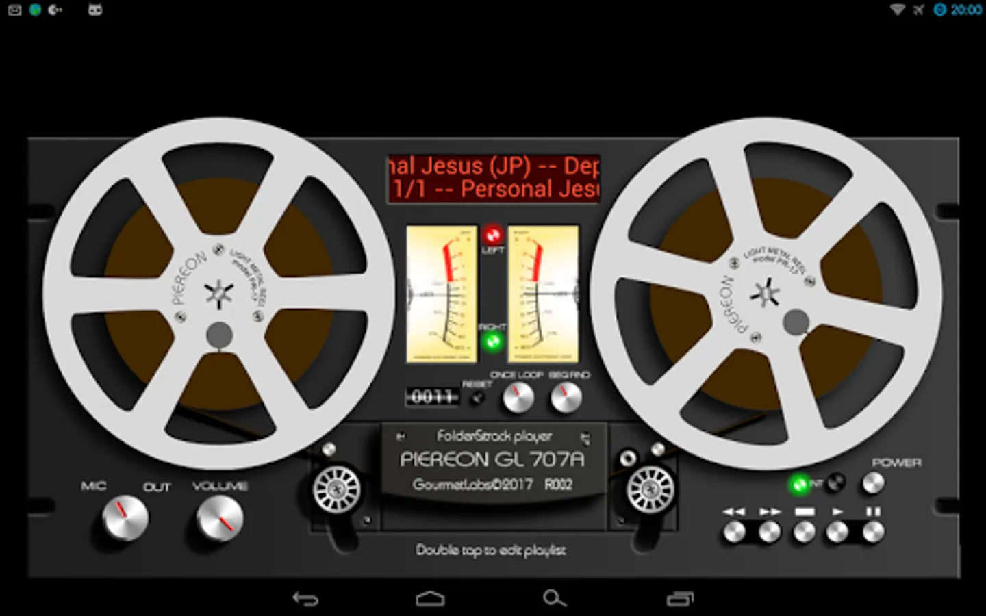 PLEASE READ THIS DESCRIPTION BEFORE USE! This is a music player for entire folders and individual tracks. It supports all music formats supported by Android. Even it can control third party players and show playing sound level. Interface simulates main controls and indications including alive VU-meters. Entire look and feel are based on one of the famous tape reel deck from near past. The name is fictitious. Remove A from name end to find same app without ads.