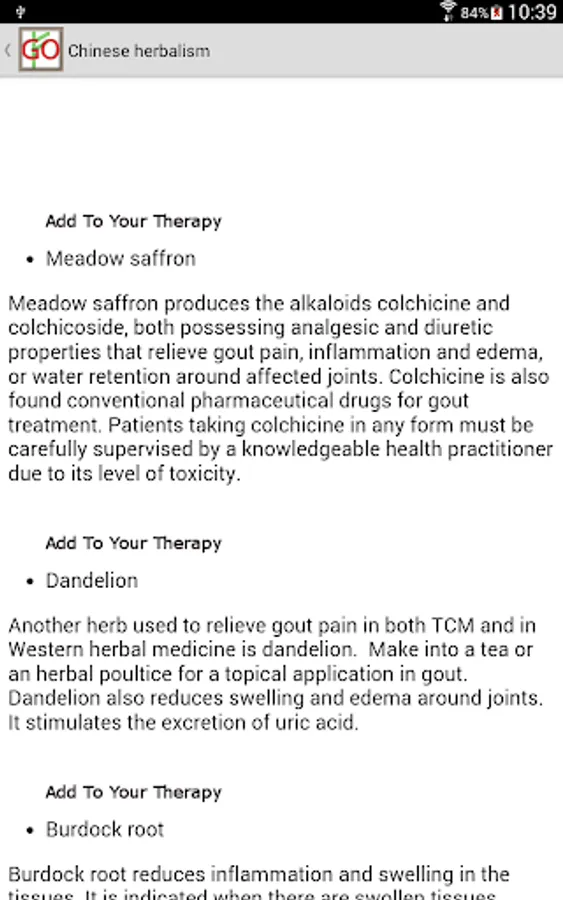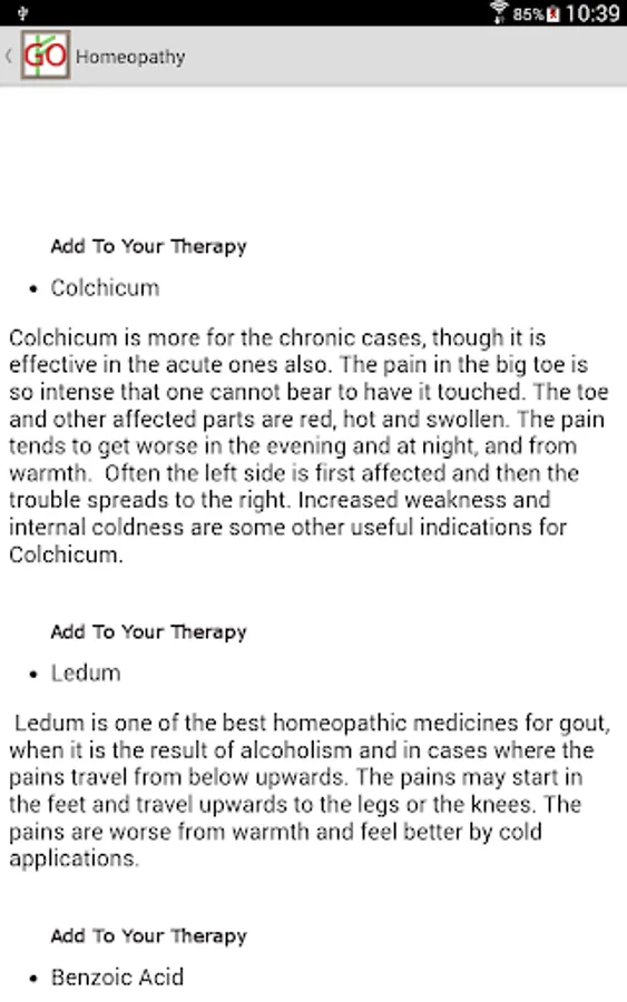 Finally, tap on Your Therapy. You will see a list of symptoms (in orange) mixed with a list of remedies (green) that you have selected. Taken together, the symptoms and the remedies form your therapy. Now all you have to do is obtain the remedies and start the process of eventual improvement of your health.