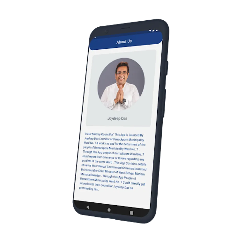 Hather Muthoy Councillor " This App is Launched By Joydeep Das Councilor of Barrackpore Municipality Ward No. 7 & works as and for the betterment of the people of Barrackpore Municipality Ward No. 7. Through this App people of Barrackpore Ward No. 7 could report their Grievance or Issues regarding any problem of the same Ward. This App Contains details of various West Bengal Government Schemes launched By Honourable Chief Minister of West Bengal Madam Mamata Banerjee as well as Various News regarding Barrackpore Vidhan Sabha's Honourable MLA Shri Raj Chakraborty's various Development Works around Barrackpore Vidhan Sabha. Through this App person of Barrackpore, Municipality Ward No. 7 Could directly get in touch with their Councillor Joydeep Das.