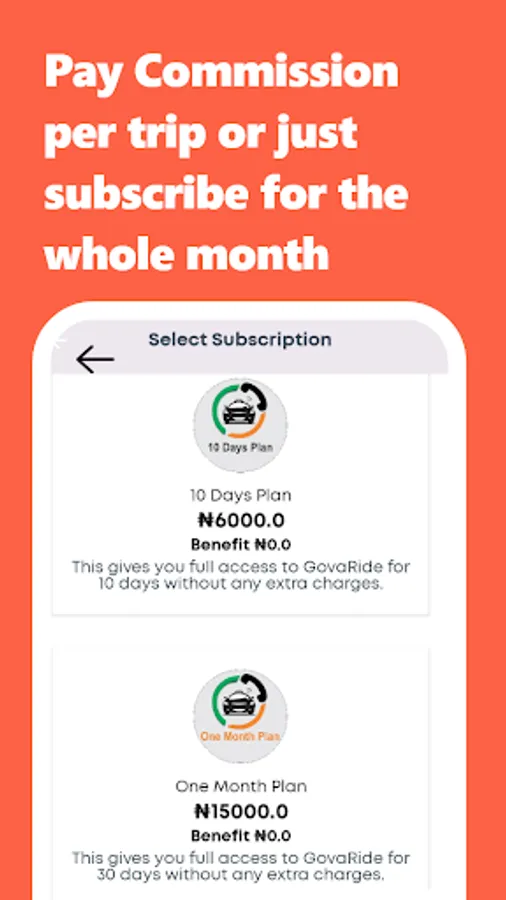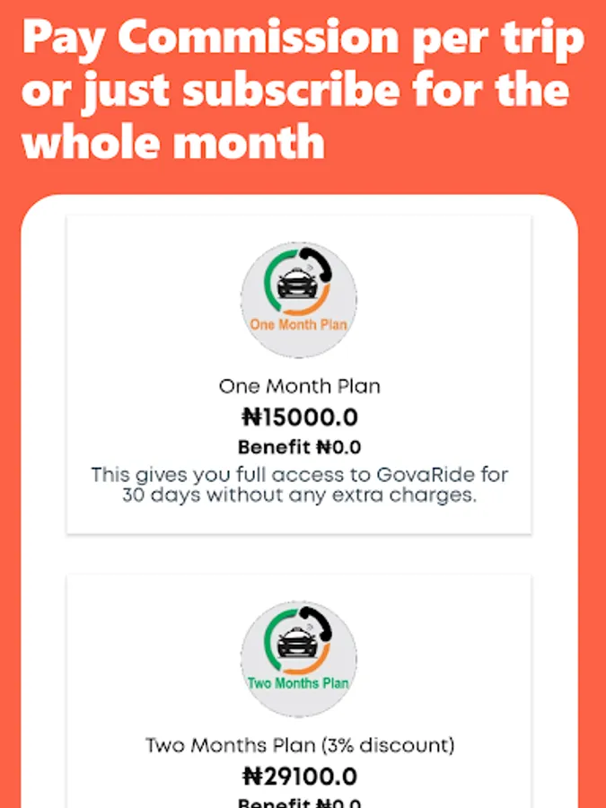 GovaRide is currently the first and only Ride-Hailing platform across the whole world to create Two service account system designed for Drivers to choose from. The first one is called: COMMISSION BASED SYSTEM and the second one is called: SUBSCRIPTION BASED SYSTEM.