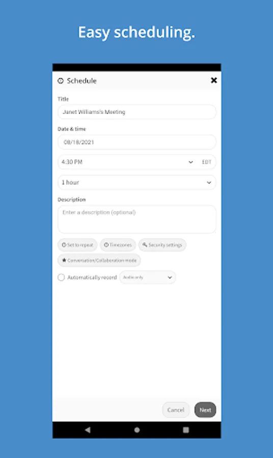 ● Schedule calls on the go or start a call on-the-fly with the click of a button