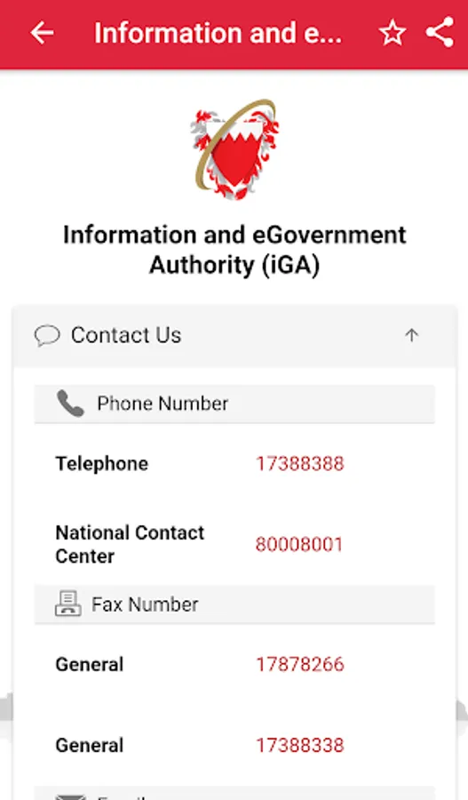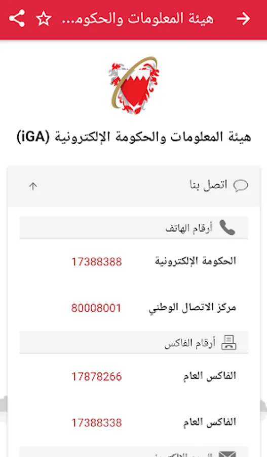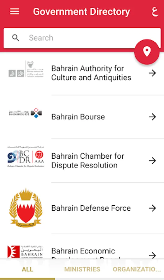 This application provides a list of Government Entities that includes contact numbers, social media accounts and interactive map of the entities located in the Kingdom of Bahrain. The app also enables users to search for a specific Government entity or its employees from director level and above; also it has the facility of calling, emailing, adding contact to phone address book and mark it as a favorite.
