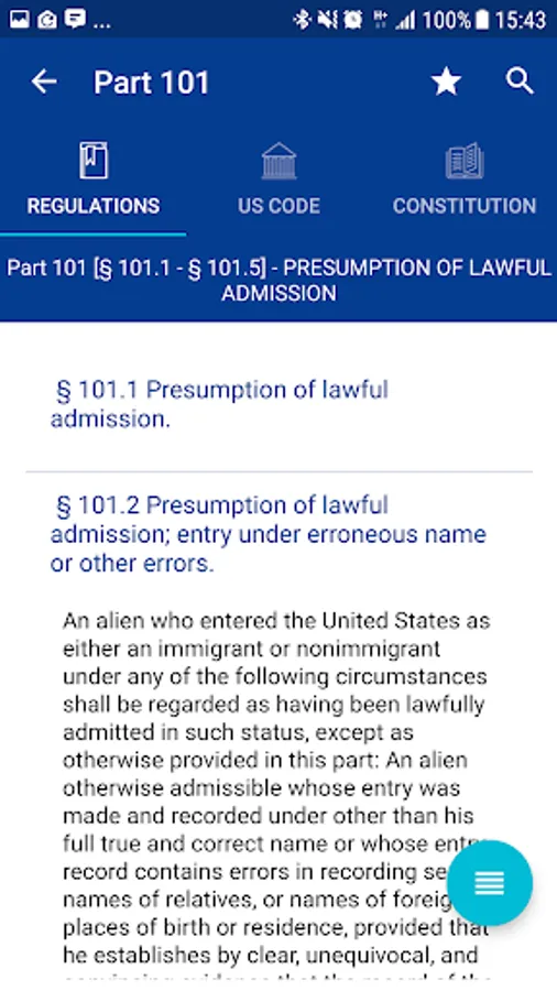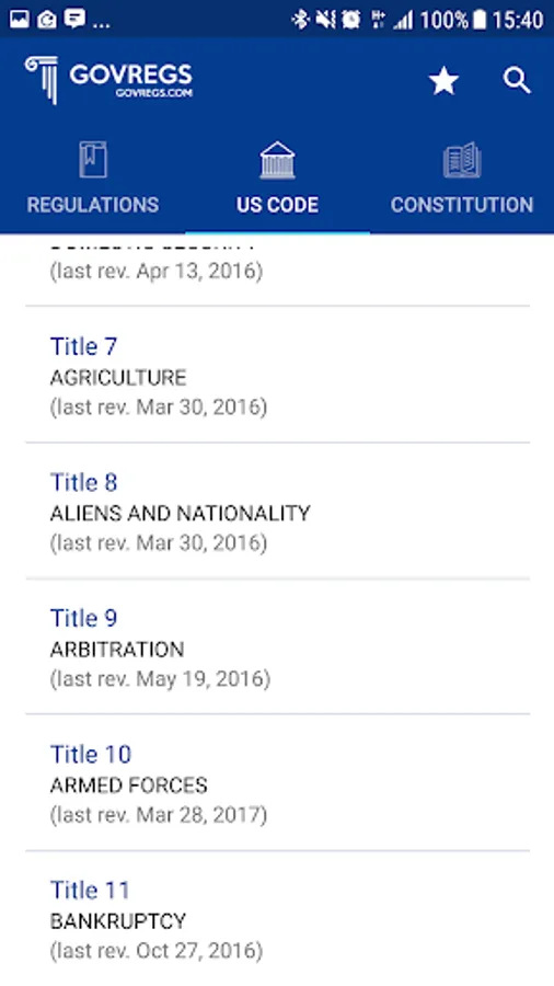 Regulations and US Code come with notes & annotations, including listing of public laws. Through this app, you will be able to access IRS and tax regulations; FDA laws; NASA's rules; Fish & Wildlife; shipping rules; import and export requirements; labor laws; First Amendment on freedom of speech, and much, much more.