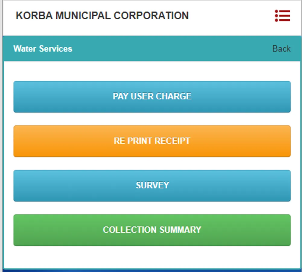 Core functionality of app is also to help citizen of Korba Municipal Corporation in payment of Water Usage Tax. Water Usage Tax Collectors of Korba Municipal Corporation who visits Door to Door of citizen use this app to efficiently keep track for tax incurred by Citizen under Water Usage Charge. This app helps tax collectors in generating and printing receipts via bluetooth printers.