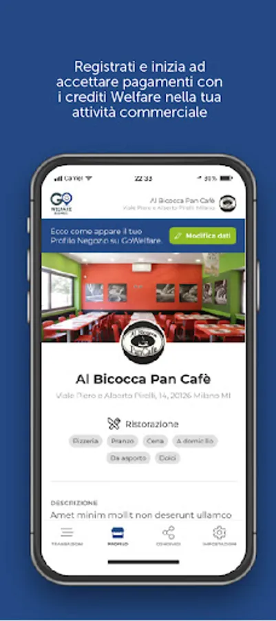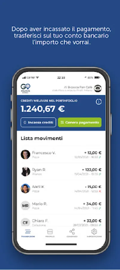 Gowelfare is the app that allows you to accept credits (fringe benefits) directly in your shop in a simple, fast and secure way with your smartphone