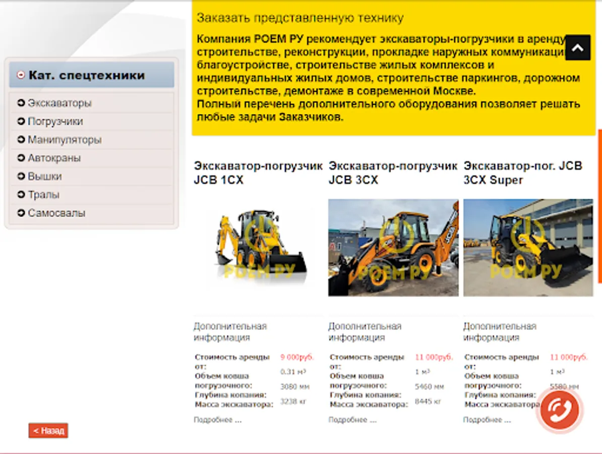 The ROEM RU company recommends backhoe loaders for rent in construction, reconstruction, laying of external communications, landscaping, construction of residential complexes and individual residential buildings, construction of parking lots, road construction, dismantling in modern Moscow.