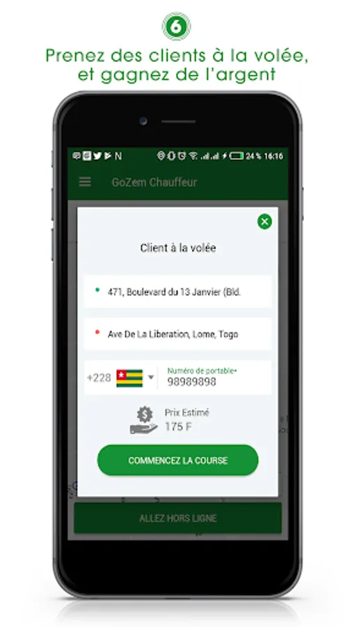 Gozem Champion allows you to get new customers every day with immediate payment. You will also gain access to clients seeking security, a fixed price and hospitality. (You will then access customers who are looking for more security by offering them a fixed price and your kindness)