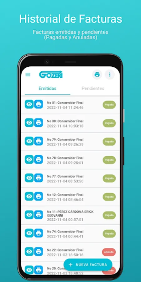This application is just a piece to make invoices from a device without an Android system, to use this application it is first necessary to configure a company on the Gozeri.com portal.