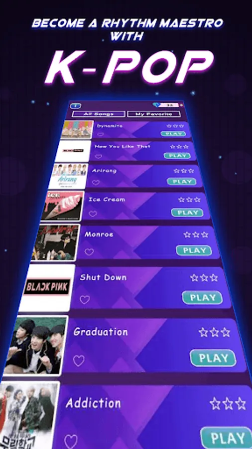 Immerse yourself in Korean rhythm as you skillfully drag your aim and shoot tiles with a swipe. Feel the Kpop music pulse through your fingers! Play and groove to the beats of your favorite Kdrama & K-pop tunes, featuring icons like Jin, Suga, J-Hope, RM, Jimin, V, Jungkook, Jisoo, Jennie, Rosé, Lisa, and more.