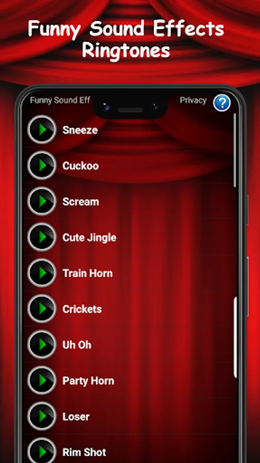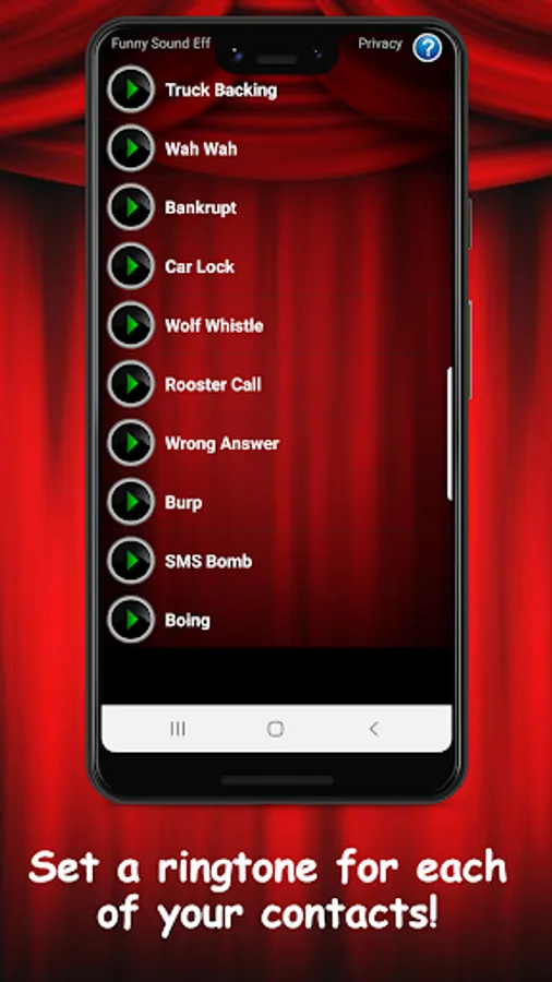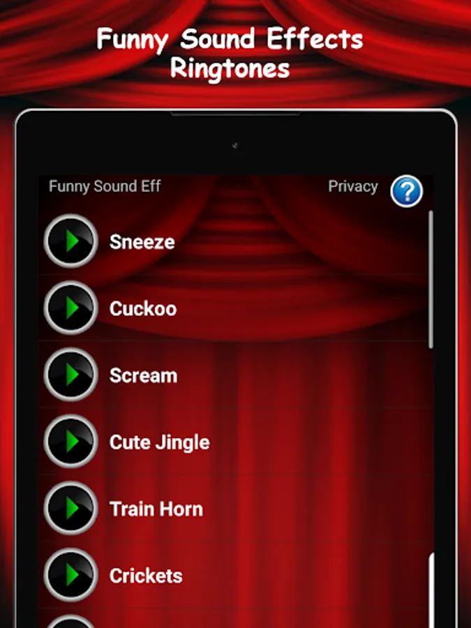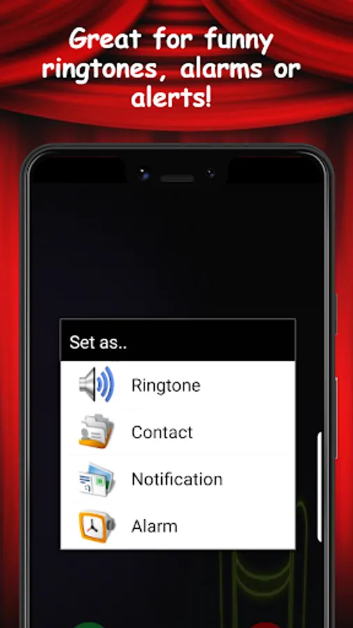 This application brings 45 funny sounds effects to use as your default ringtone, your alarm, or your notification (text and email).