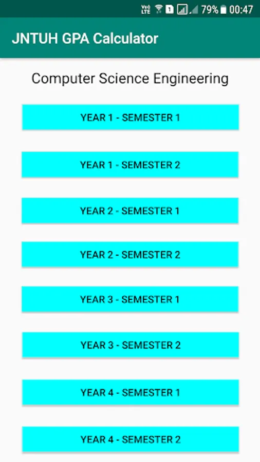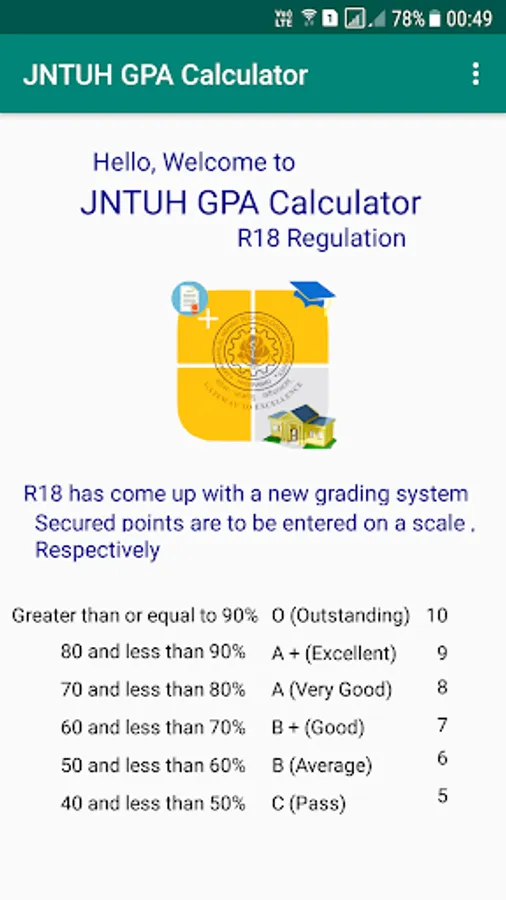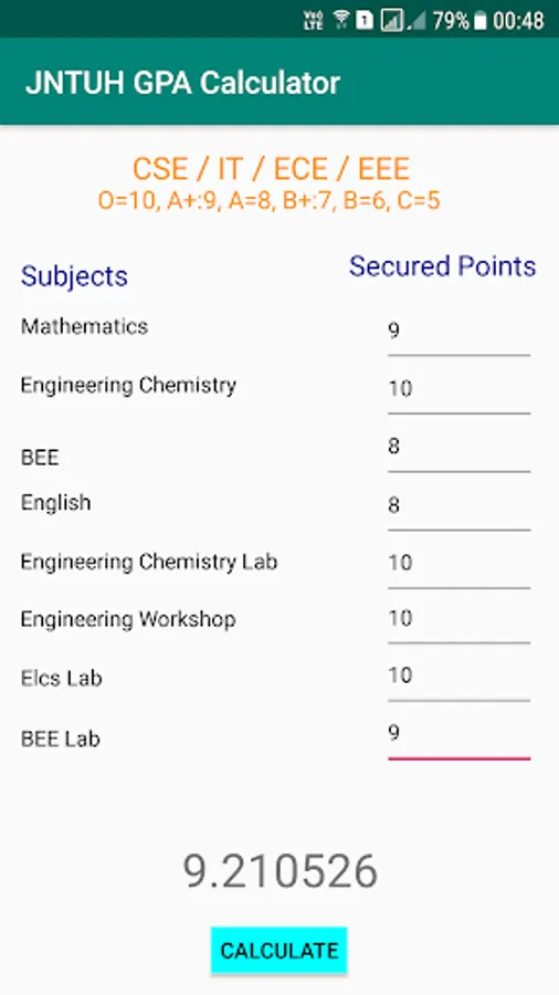 JNTUH GPA Calculator for 1-1 / 1-2 / 2-1 / 2-2 / 3-1 / 3-2 / 4-1 / 4-2 Semesters.