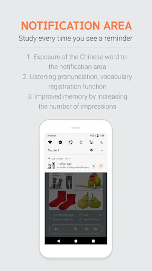 - Chinese word is exposed in the notification area. Improve your Chinese learning.