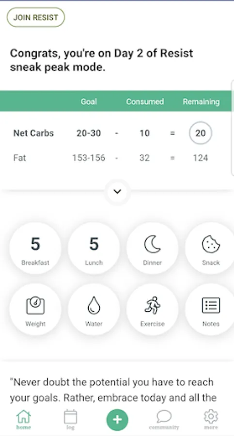 Easily input all of the foods and drinks you eat. Resist™ will calculate the macros in your foods to tell you how many net carbs, proteins, fats and calories you have remaining each day.