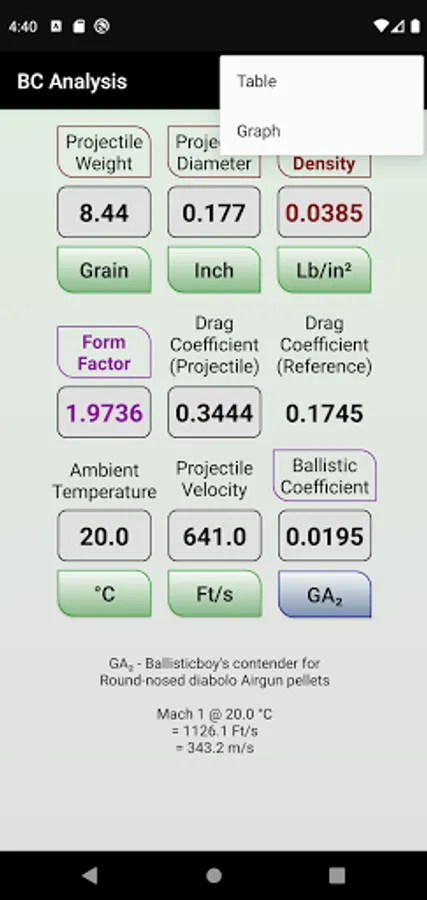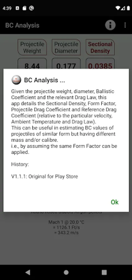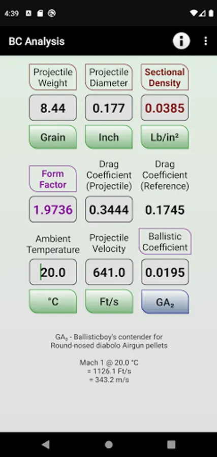 Given the projectile weight, diameter, Ballistic Coefficient and the relevant Drag Law, this app details the Sectional Density, Form Factor, Projectile Drag Coefficient and Reference Drag Coefficient (relative to the particular velocity, Ambient Temperature and Drag Law).