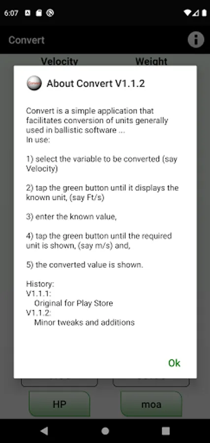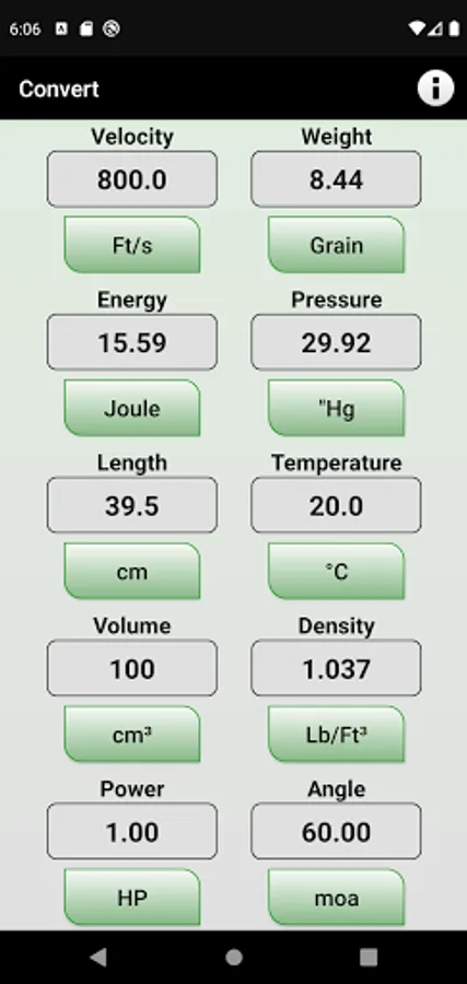 Convert is a simple application that facilitates conversion of units generally used in ballistic software ... Velocity, Weight, Energy, Pressure, Length, Temperature, Volume, Density, Power and Angle.
