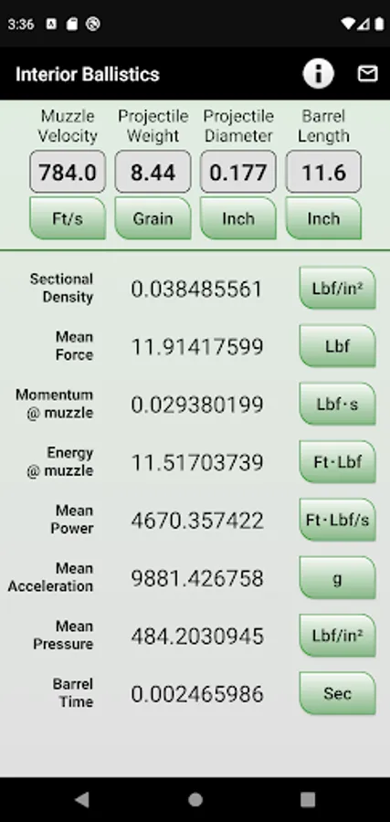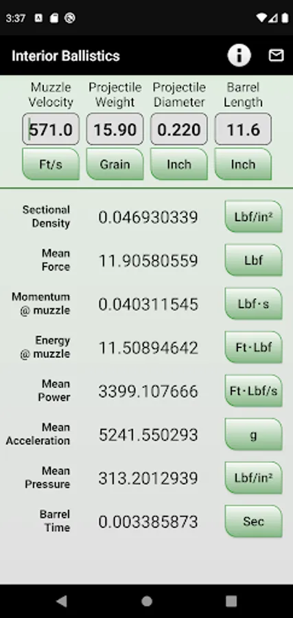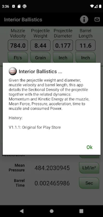 Given the projectile weight and diameter, muzzle velocity and barrel length, this app details the Sectional Density of the projectile together with the related dynamics: