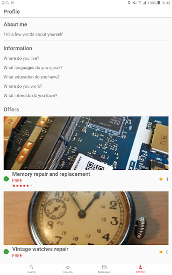 Easily create offers for people nearby: just tap Add offer in your Profile and fill in offer title and description and upload offer photos. You can offer anything. Your offers are limited only by your imagination.