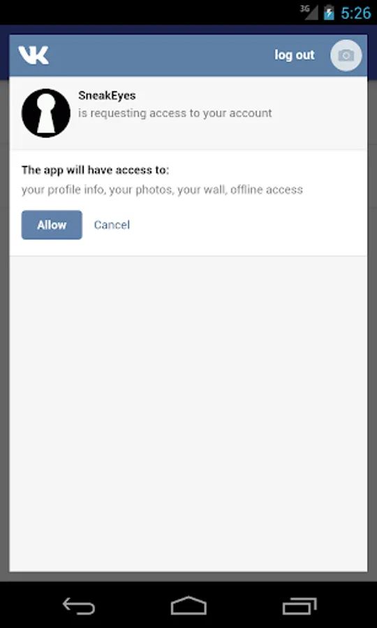 Automatically take photos from device cameras (front and back) without preview at given periods of time and post them to user's VK wall with current location.