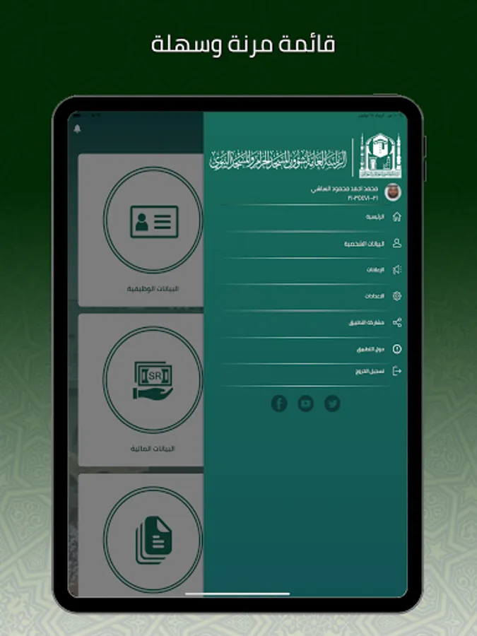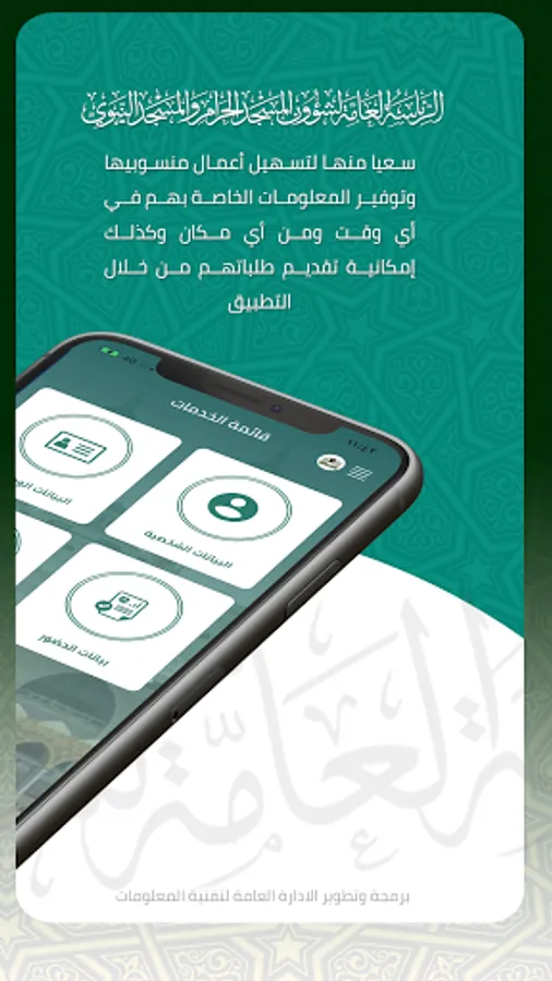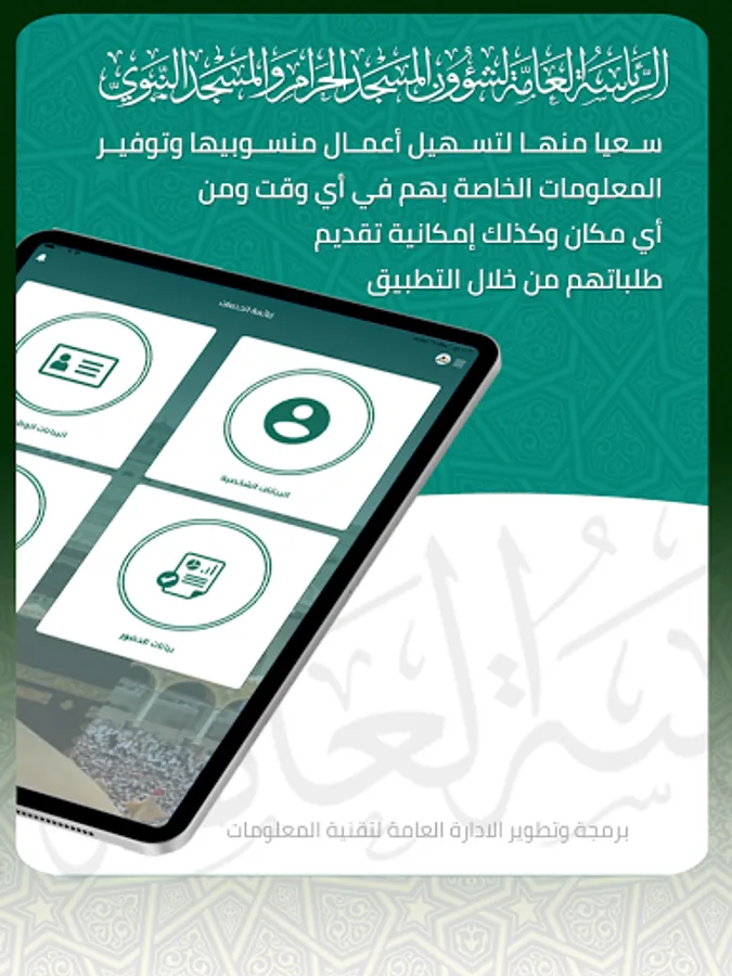 In pursuit of the General Presidency of the Grand Mosque and the Prophet's Mosque to facilitate the work of its employees and provide their information at any time and from anywhere, as well as the ability to submit their requests through the application with ease and ease