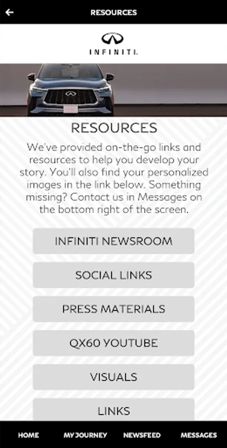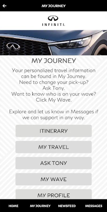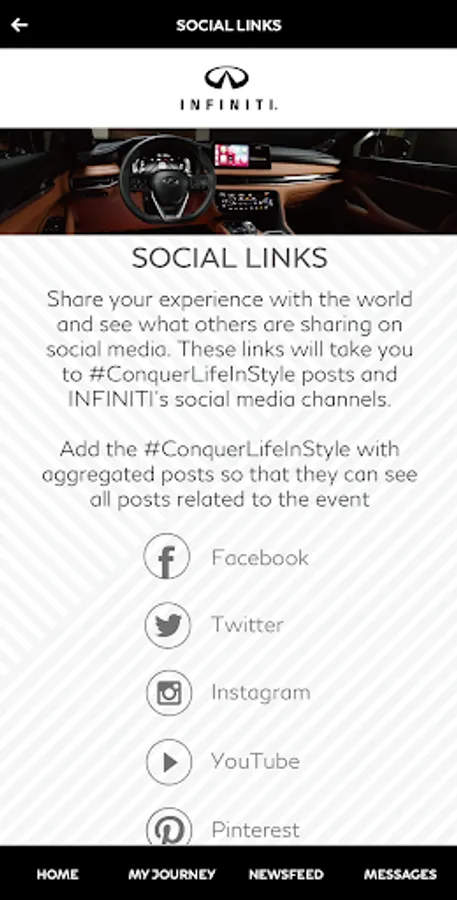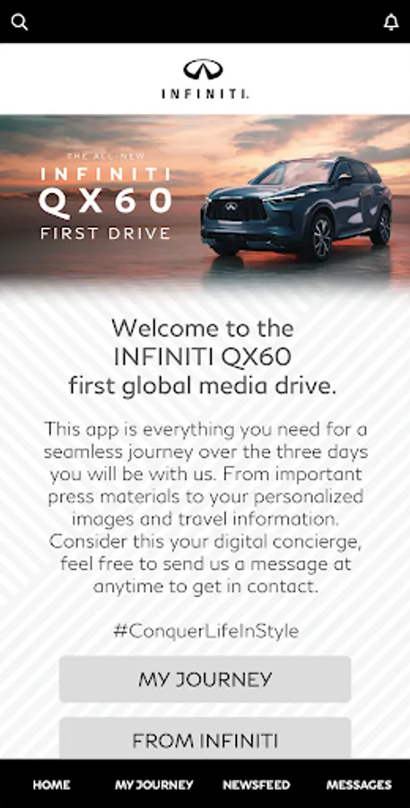 Invite only app for Infiniti North America media events and meetings. An app to help support Infiniti events by providing event information and ways to engage with various Infiniti event experiences.