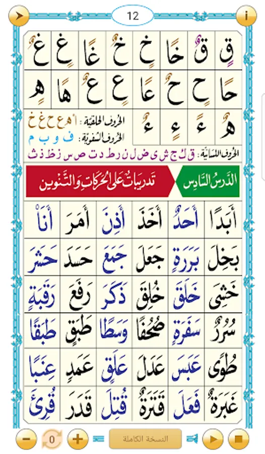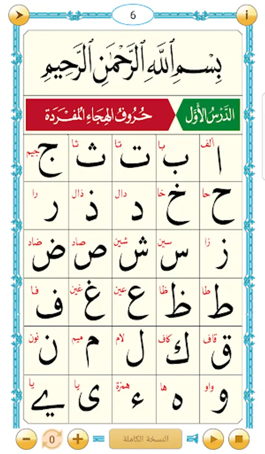 Criterion Group for Education and Information Technology is pleased to submit this application on smart phones to our valued customers, which includes the base Alnoranih voice and image lessons, and was programmed so that it is easy to use and more attractive for students; and helps to acquire the basic skills to learn Arabic and the Quran, namely: (a skill hearing, speech, reading), asking God to benefit our sons and daughters in all over the world ...