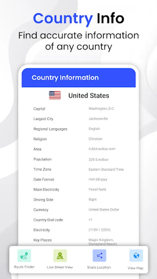 GPS navigation route finder app allows you to find the countries information like country capital, population, language, area, borders, currency, and call code.