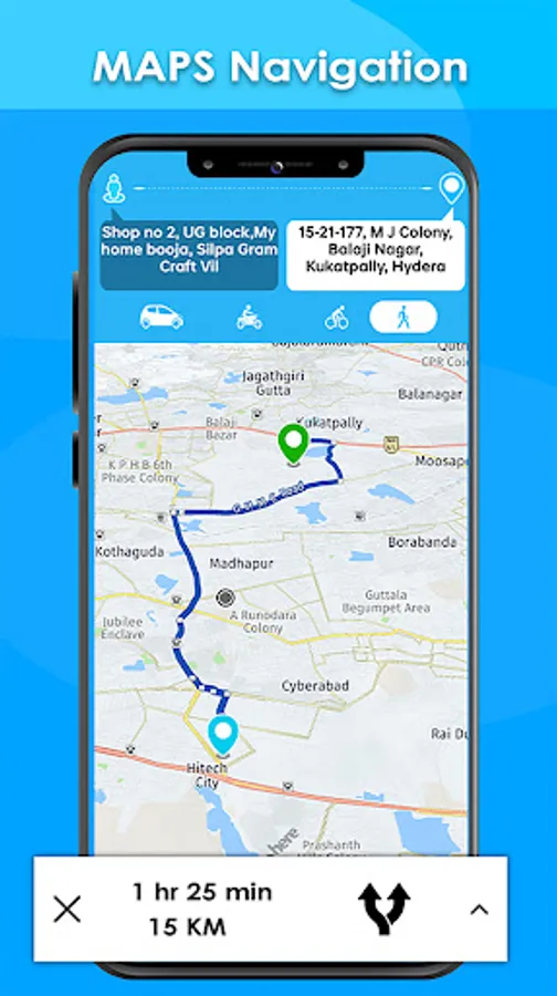 Our maps navigation explore feature allows you to find any place on a map. You can also search places by name and get live navigation home. Our maps navigation app provides multiple navigating features. User can use maps navigation between source and destination points on map. They can view multiple angles, zoom in and out, get directions for driving, bus, walking, bike, and more.