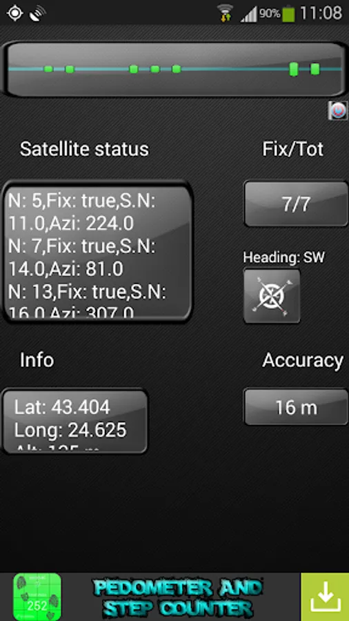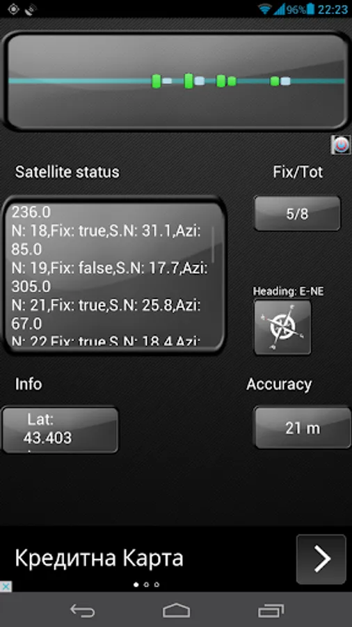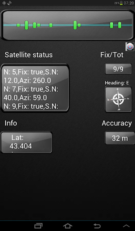 * Satellite signal (SNR) bar chart. Green bars indicate that the current satellite is used in the fix, while the blue ones show that the satellite is visible, but it is not used for a position fix.