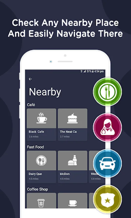 A gps navigation that talks application will give you nearby famous places and make sure to give you details like Atm, mosque, hospital, restaurants, car repairs, laundry, market, doctor, railway station, museum, bakers and parking or offices too