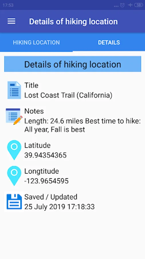 6. You can save and manage your hiking location (in real time using GPS provider or using coordinates or by clicking on map). Moreover you can navigate to a specific hiking location.