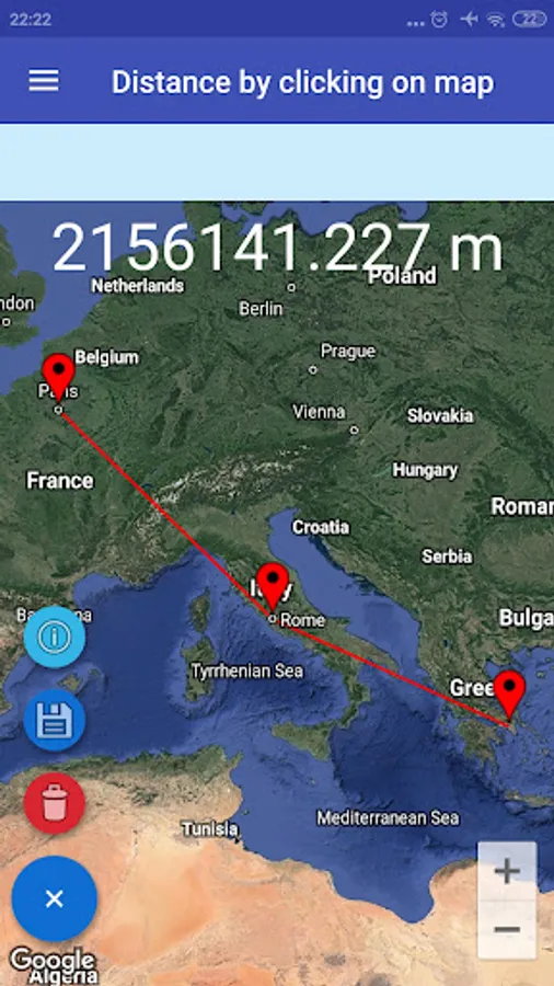 1. Calculate the distance between two or more points by clicking on map. Each time the application will display the distance. You can delete the last point every time you press delete button. You need at least two point to save the measurement. Also you have the choice to display the current location on map using network or GPS provider.