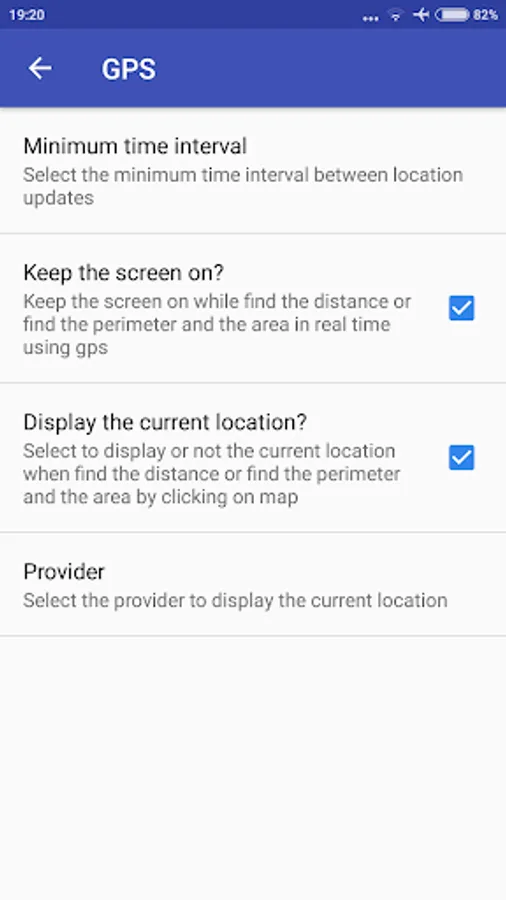 j) Select to display or not the current location when find the distance or find the perimeter and the area by clicking on map (using network or GPS provider).
