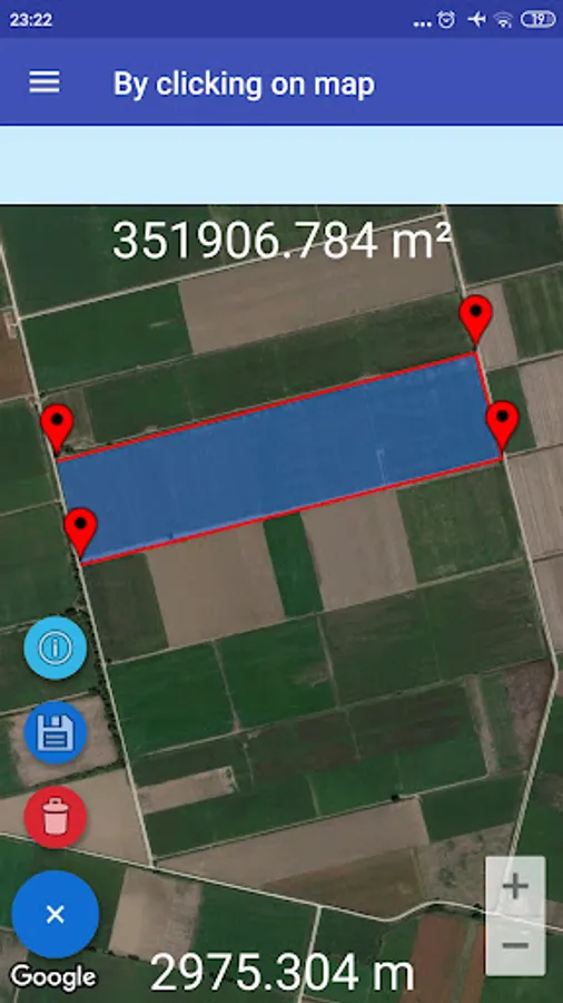 4. Calculate the area and the perimeter between three or more points by clicking on map. Each time the application will display the area and the perimeter. You can delete the last point every time you press delete button. You need at least three points to save the measurement. Also you have the choice to display the current location on map using network or GPS provider.