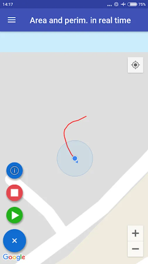 5. Calculate the area and the perimeter in real-time using GPS by walking, driving, running etc. The application will track you displaying a line on map just press start record button and start moving. Press stop and save button to save the measurement.