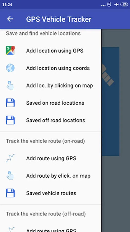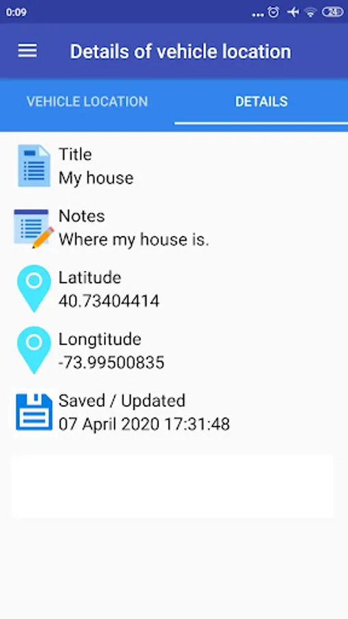 5. You can save and manage your vehicle location (in real time using GPS provider or using coordinates or by clicking on map). Moreover you can navigate to a specific vehicle location.