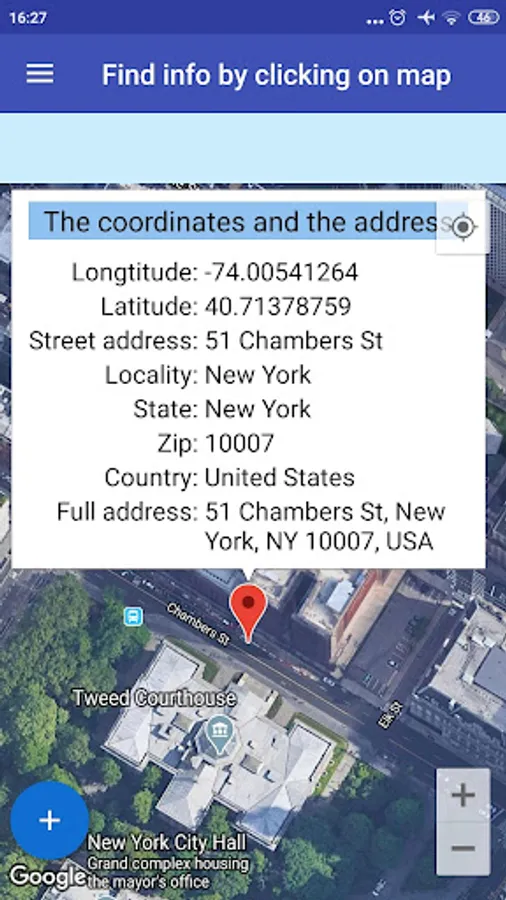 Also you can find an address using coordinates, you can find coordinates and address by clicking on map and you can find the distance (for on-road and off-road routes) using either coordinates or by clicking on map. Moreover you can get coordinates (longtitude and latitude), speed, altitude, bearing, full address (street address, state, zip, country, etc.) and to see your current location on map using GPS provider in real time.