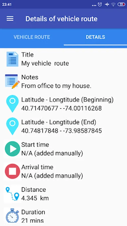6. You can save and manage your vehicle routes (for on-road and off-road routes). The application let you record and plan your vehicle routes (the title, the notes, the beginning longtitude and latitude, the end longtitude and latitude, the start time, the arrival time, the duration, the distance, the max speed, the average speed, the max altitude, the min altitude and the saved - updated date) and save them for the review and analysis. Moreover you can navigate from your current location to the beginning, to the end and to follow the vehicle route.