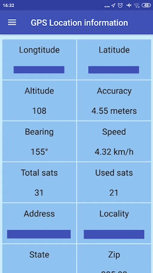 3. You can get the current location information in real-time using GPS provider. More specifically you can get the longtitude, latitude, altitude, accuracy, bearing, speed, provider and the full address every time duration and distance you select by settings.