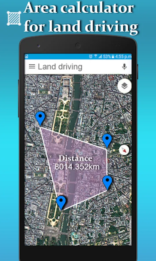 GPS Area Calculator is useful to calculate GPS area or distance with great accuracy. Once you place your points on the map and then calculate area between all points. You can also find out the distance between multiple points on map. Especially if you need to calculate bigger area like area of city or country, you can easily calculate it by using this app. Paddock measurement is very easy now, this plan meter is best option to measure all type of land like constructed or unconstructed, agriculture fields, forests, rivers, dams, sea, mountains. This app shows view of land directly form satellite. You have no need to go to site for measuring land. Just open this app in your mobile, it will do field work for you. This app is very helpful for construction planning. It shows details about the whole terrain of land and buildings on the land from satellite camera. Satellite camera shows live view of land. GPS Area Calculator has no limits, you may calculate area of countries and continents within few seconds.