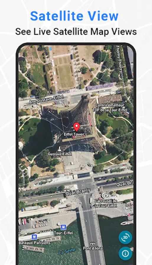Live Satellite View, GPS Map and Voice navigation is a user-friendly driving directions app with a purpose to help travelers to exploring the live earth map of the world. The GPS maps voice navigation app is very easy to use, through updated satellite map with property lines, HD street view maps, discovering unique locations and route maps. The 3D street view GPS navigation system allows users to get live driving directions, geographic location with a compass, location navigator to find current location and traffic map to fetch live traffic updates. Plan your road trips with Live Satellite View Map and GPS Voice navigation for all countries of the world with accurate driving direction finder feature to enjoy silky-smooth GPS navigation on live maps. Explore world map satellite view along with world famous landmarks and visit the world using free GPS for android integrated with map directions, and route directions features. The location tracker helps find your live location (without compromising your privacy) & also helps tourists to search nearby areas with smart satellite map app. Navigate live GPS maps go to get shortest routes with simple travel directions for earth map explore.