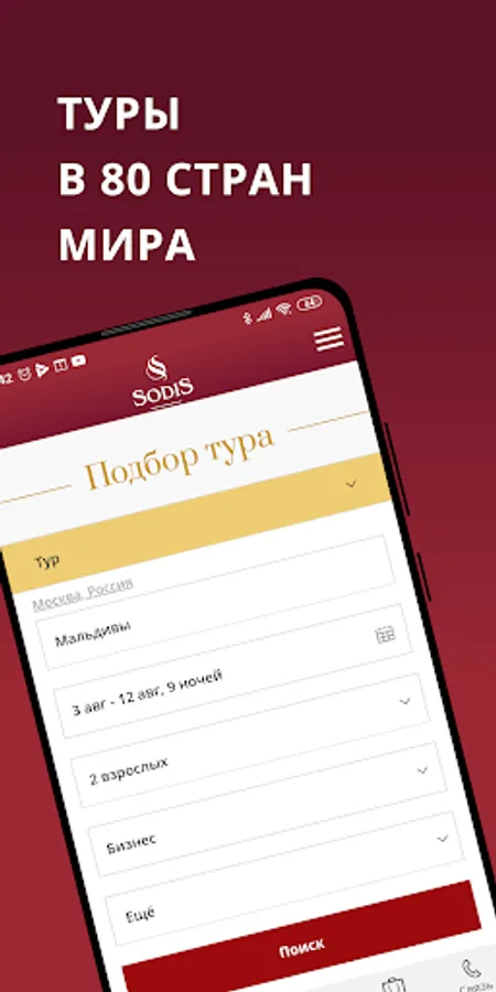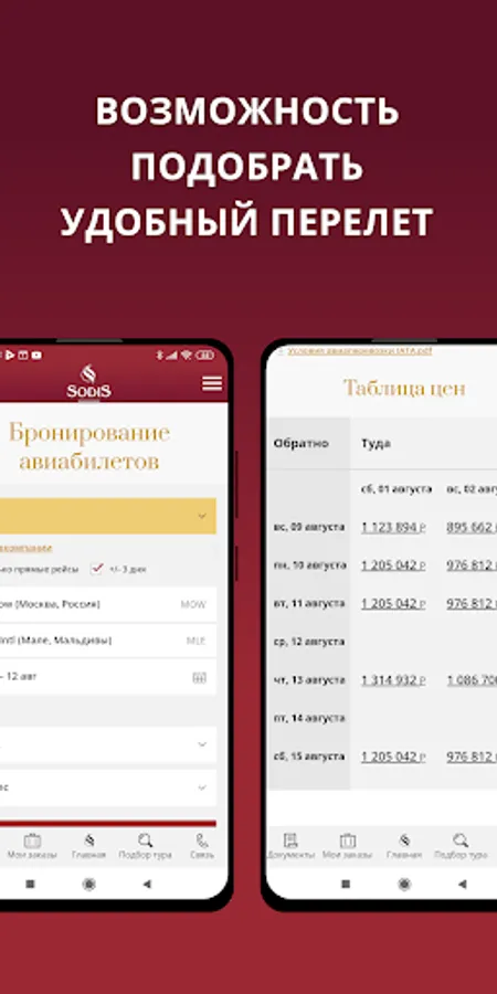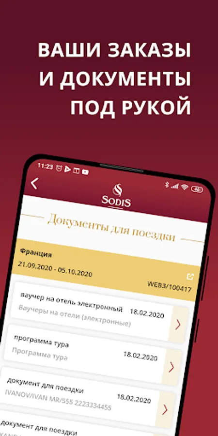 The Sodis app is the perfect travel assistant. Your documents are always with you offline in the "Documents" section. Any changes (adjustments made by the manager, payments, etc.), as well as future trips at hand, are in the "Orders" section.