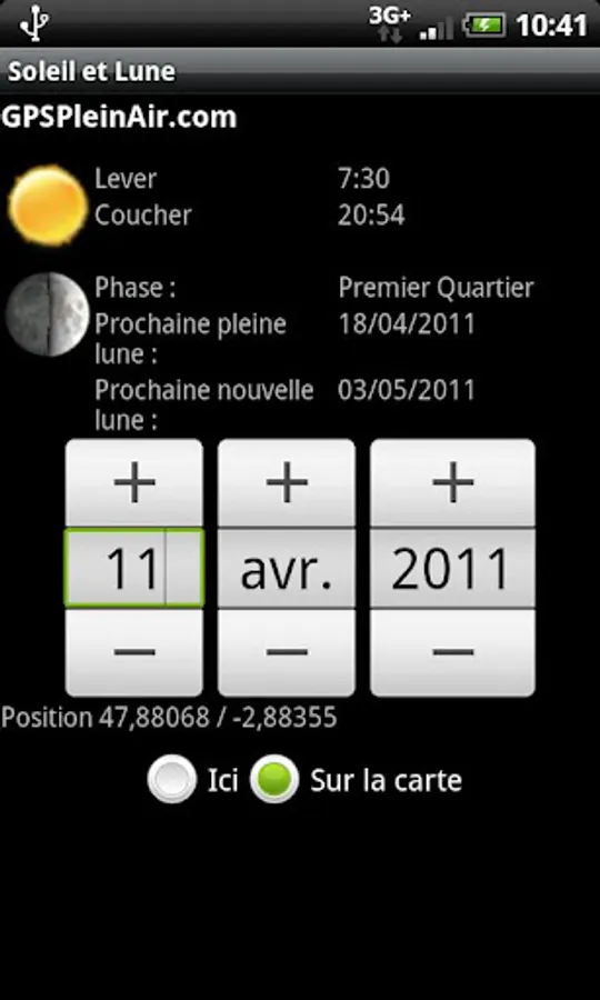 Computes sunrise and sunset hours, moon phases, at your position or everywhere on the map.