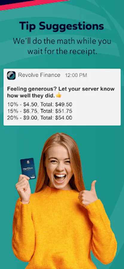 Save some brain power and let us do those quick calculations for you. Swipe your Revolve Finance Visa® Debit Card to pay for your meal and get tip notifications of 10%, 15%, & 20% of your total bill via our mobile banking app.