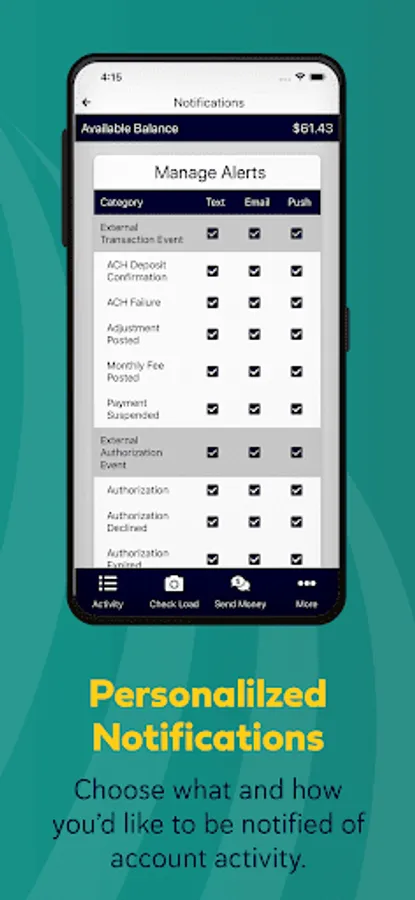 Customize account alerts around what matters most to you. We’ll let you know when your balance changes, a payment clears or your friend receives that transfer.